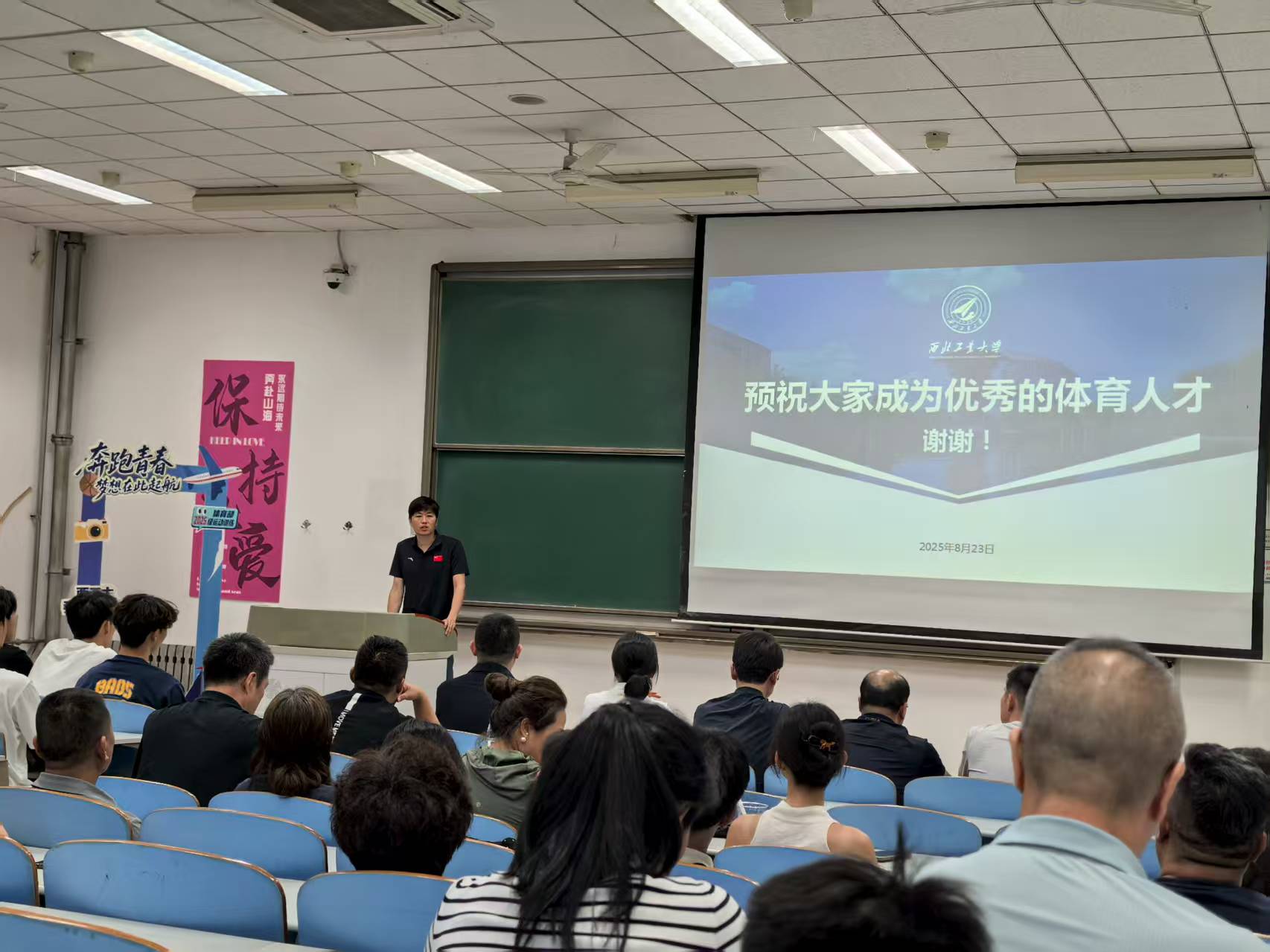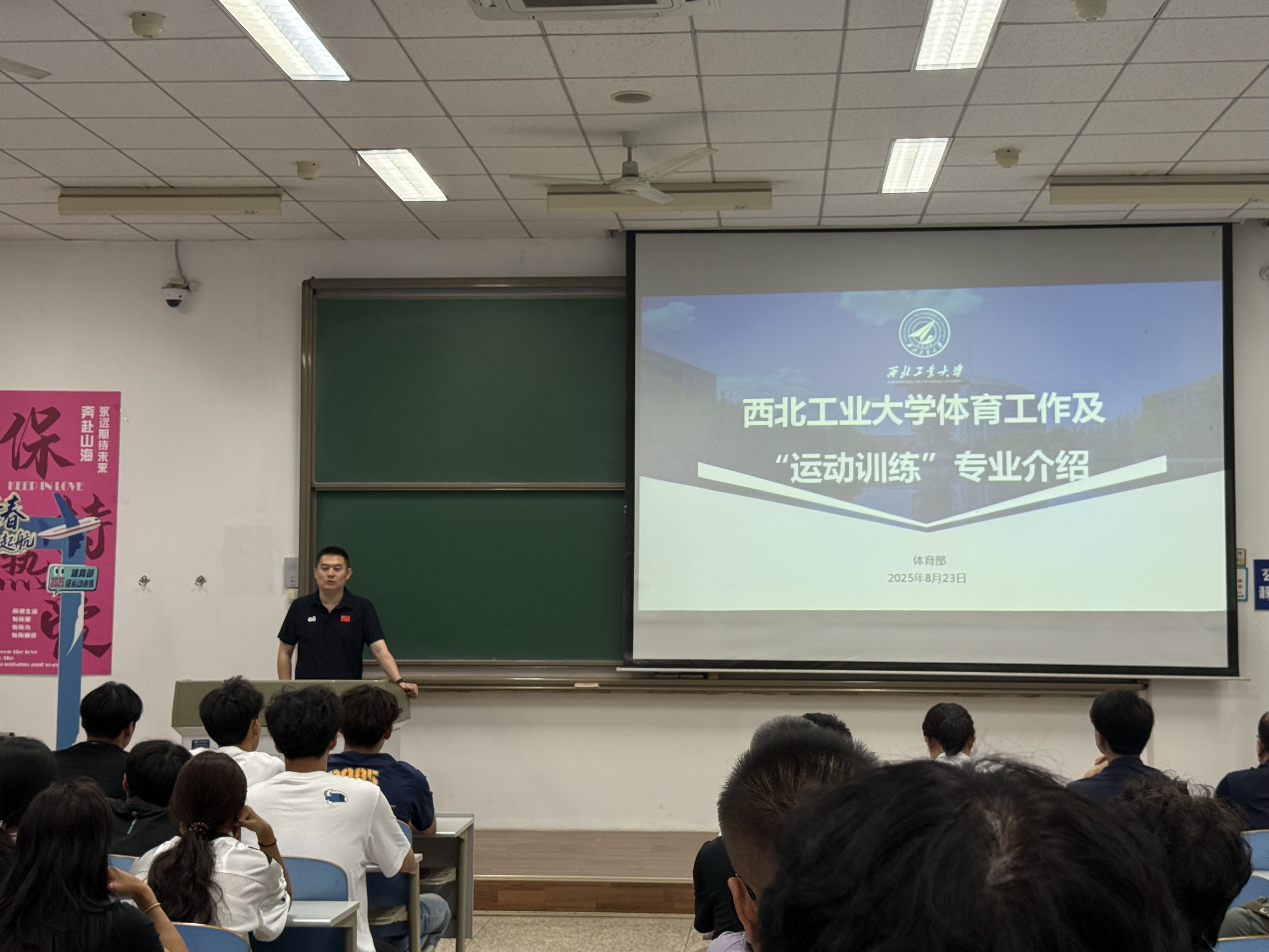 周巍为新生们详细介绍了运动训练专业,他回顾了体育部历史沿革及职能,并从体育工作开展情况、体育学科发展、国际合作交流和运动训练专业建设等方面带大家了解接下来学习、训练和生活。最后,他以以体铸魂,以训励志为主题,向新生讲授了专题思政课。他希望大家能够充分依托西工大优秀的平台,让技术与理论相互赋能,做优秀的体育人才。