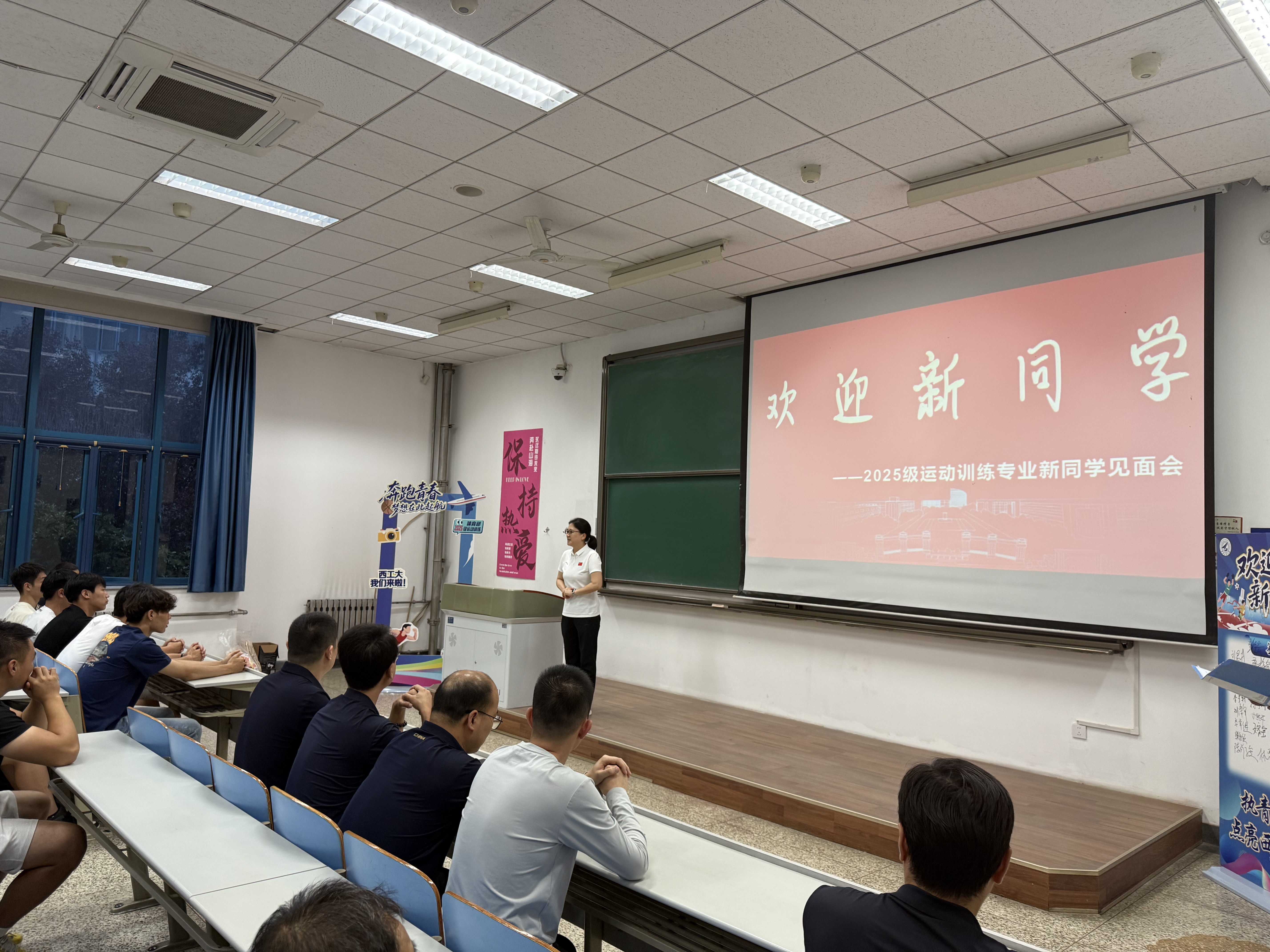 金秋送爽,丹桂飘香,西北工业大学大学体育部迎来了首届运动训练专业本科生。为帮助新生快速融入校园生活,明确学业目标,体育部于8月23日晚上7点,在西北工业大学长安校区教学西楼A-203举办了新生见面会。本次见面会由体育部副主任郭光主持,党总支书记傅莉、主任周巍、办公室主任白冰洋、学科与专业建设办公室主任蔺世杰、班主任张丽军、橄榄球队教练员徐耀铎、田径队教练员史雅坤等出席。